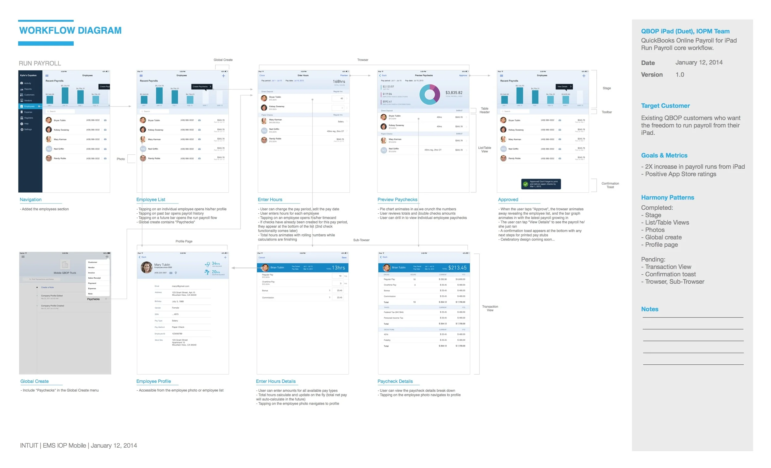 Bringing the two separate apps together was an IA nightmare. The accounting iPhone app and iPad app had different navigation structures than the web which was also different from the payroll app. I worked with cross-functional teammates to align the organization on one navigation and structured the integration accordingly. From there, we had to re-architect the primary payroll flow to work in both landscape and portrait and to follow the new Harmony guidelines.